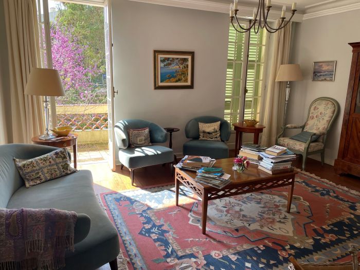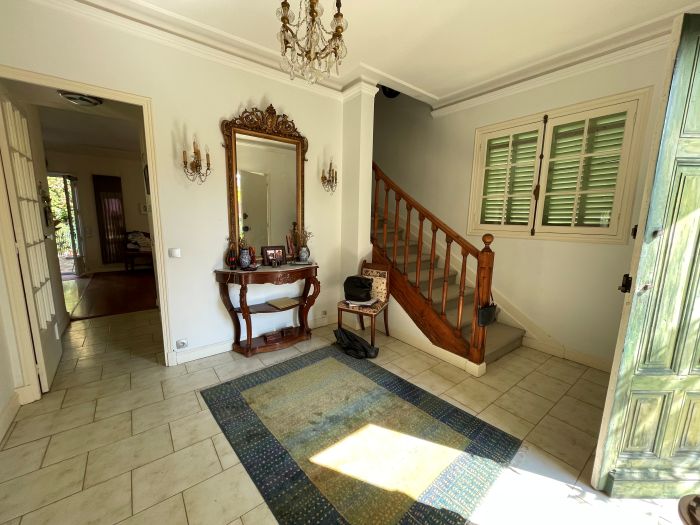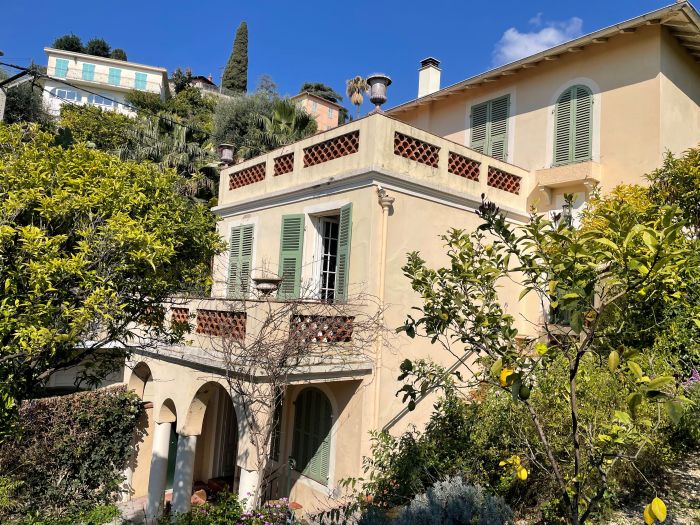 A very pretty villa of the turn of the Century and originally being part of a large domain. The house is developed onto 3 levels. Independent apartment and large private garage. Space for a pool with the right permissions. Nice architectural features such as 3 meter high ceilings, arched windows original French doors and a marble fireplace. Walled cottage style gardens and large terraces planted with Avocados, oranges and clementine. A very lovely family home with lots of space and large volume, located in the very residential area of Menton Garavan and is literally 100m from the sea front, train, buses, shops, restaurants, church, port etc etc.