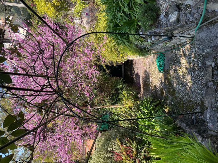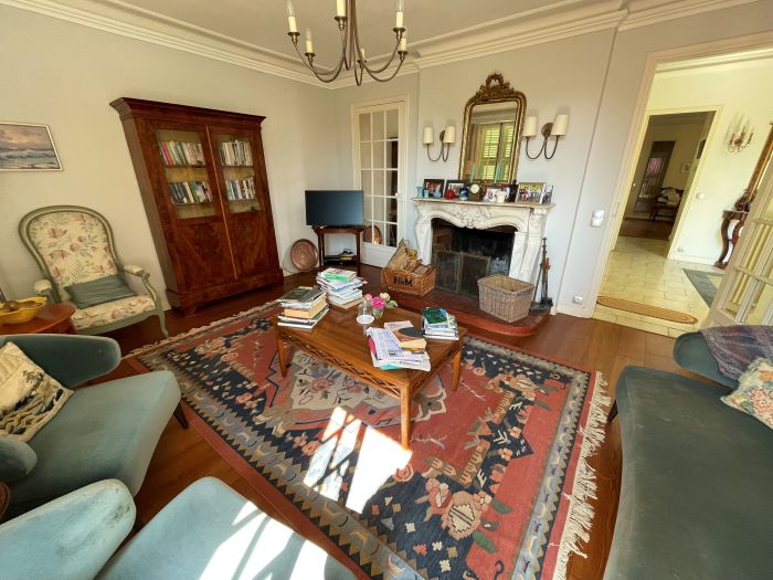A very pretty villa of the turn of the Century and originally being part of a large domain. The house is developed onto 3 levels. Independent apartment and large private garage. Space for a pool with the right permissions. Nice architectural features such as 3 meter high ceilings, arched windows original French doors and a marble fireplace. Walled cottage style gardens and large terraces planted with Avocados, oranges and clementine. A very lovely family home with lots of space and large volume, located in the very residential area of Menton Garavan and is literally 100m from the sea front, train, buses, shops, restaurants, church, port etc etc.